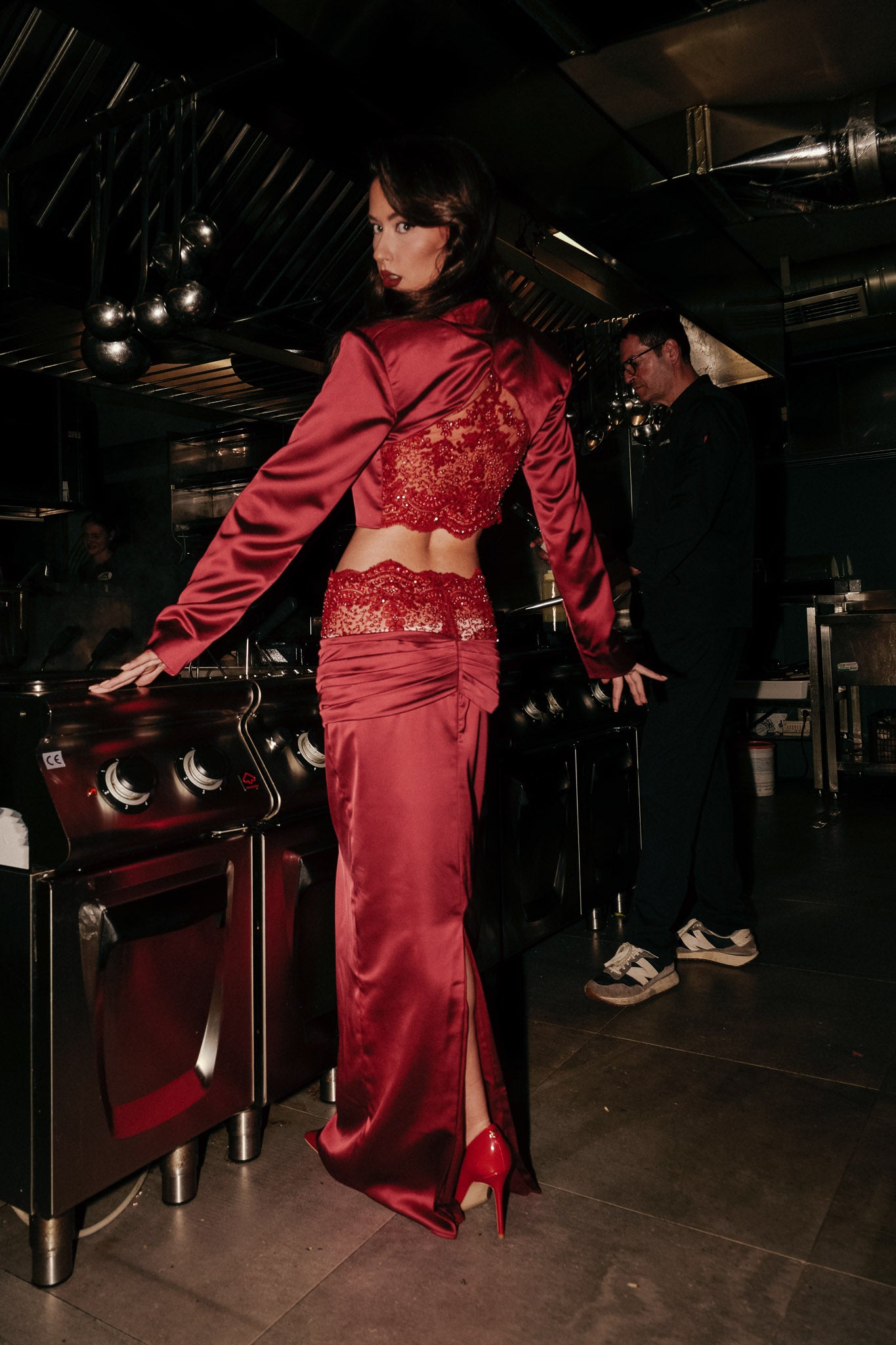 A bold reimagining of tailored elegance, this blazer commands attention with a deep, plunging neckline and a back crafted from delicate lace. Structured at the front yet ethereal at the back, it strikes the perfect balance between strength and sensuality. Every detail — from the sharp lapels to the intricate lace paneling — is designed to celebrate confidence, femininity, and modern sophistication. This is a piece made for the woman who embraces daring style with effortless poise.